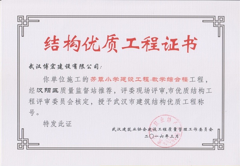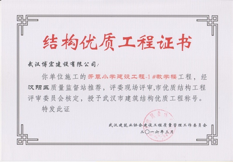 芳草小學(xué)-1#教學(xué)樓結(jié)構(gòu)優(yōu)質(zhì)工程證書(shū)