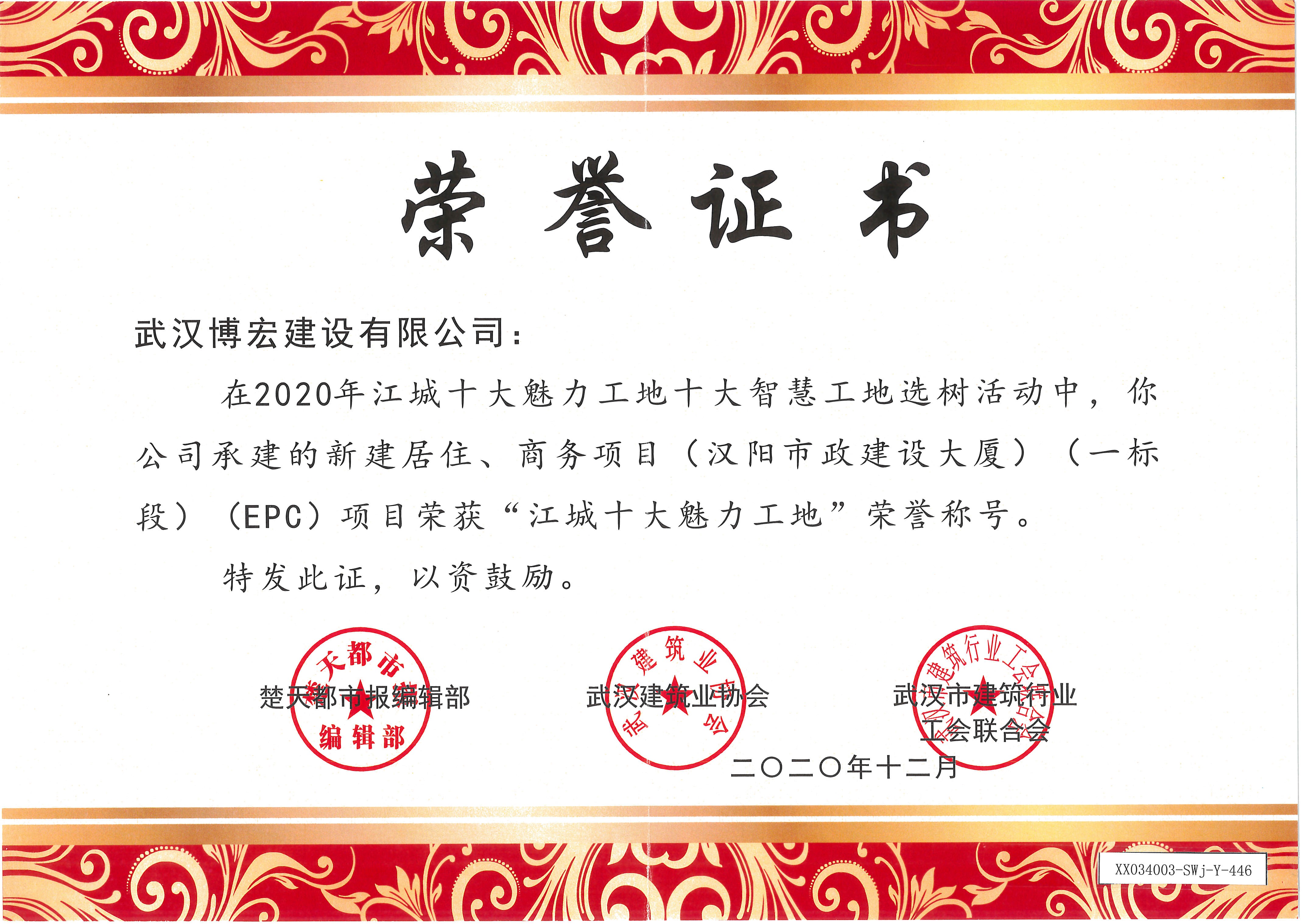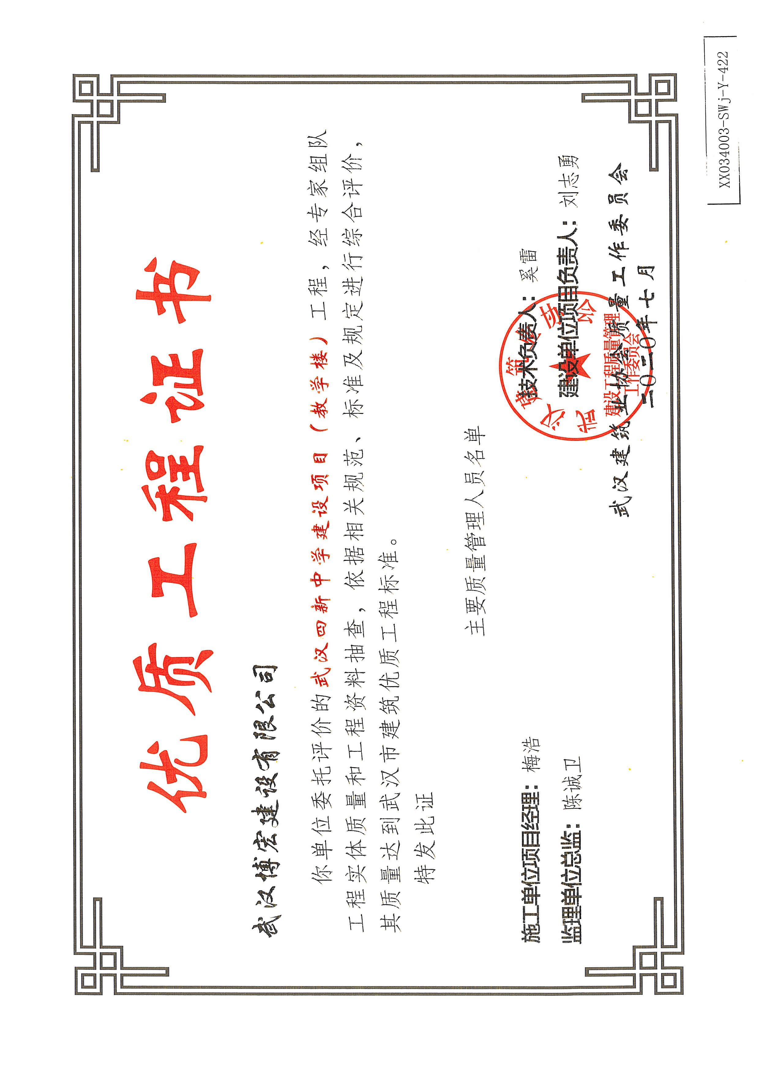 優(yōu)質(zhì)工程證書(武漢四新中學(xué)建設(shè)項(xiàng)目工程(綜合教學(xué)1--4號(hào)樓)