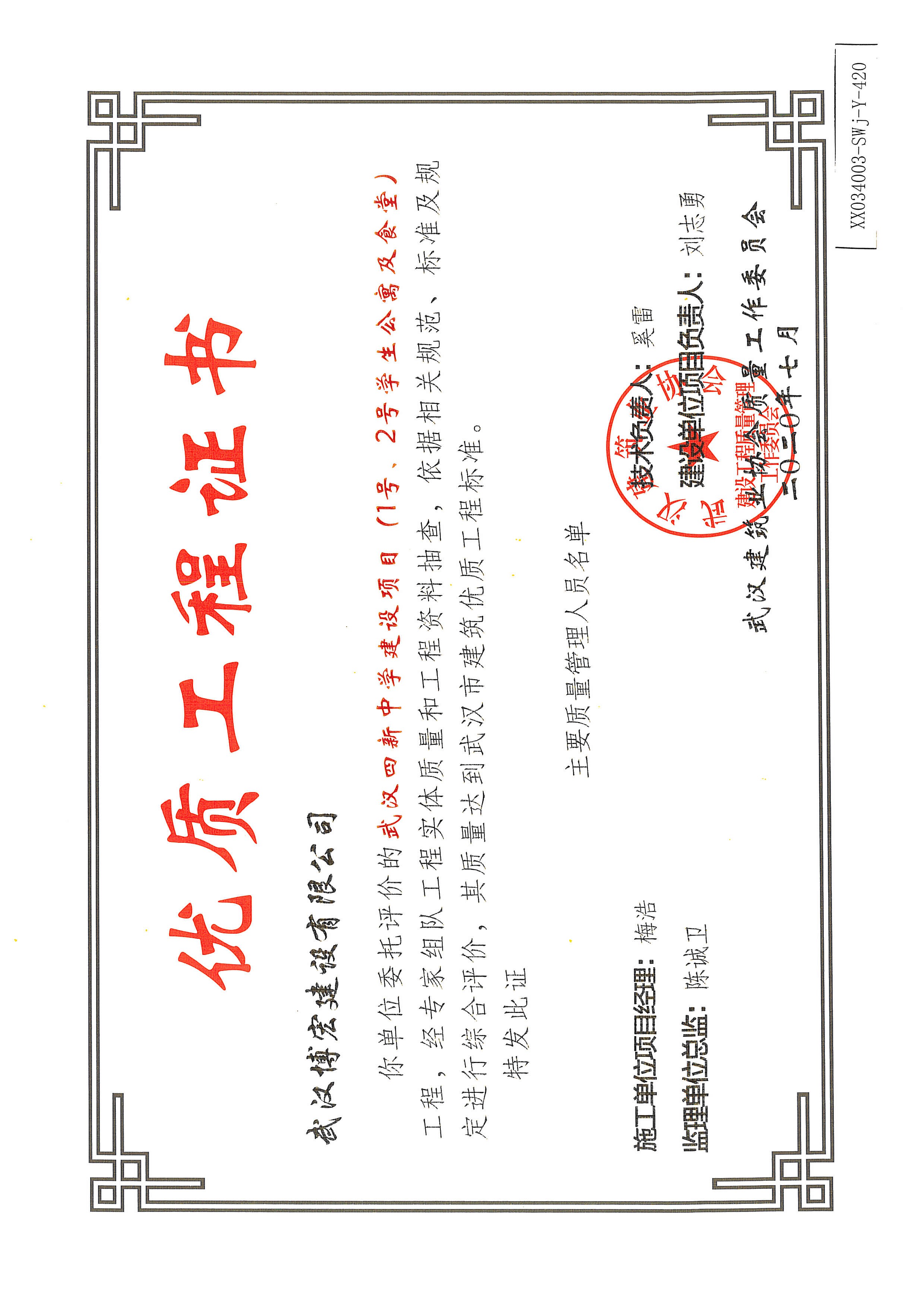 優(yōu)質(zhì)工程證書(武漢四新中學(xué)建設(shè)項(xiàng)目(教學(xué)樓)