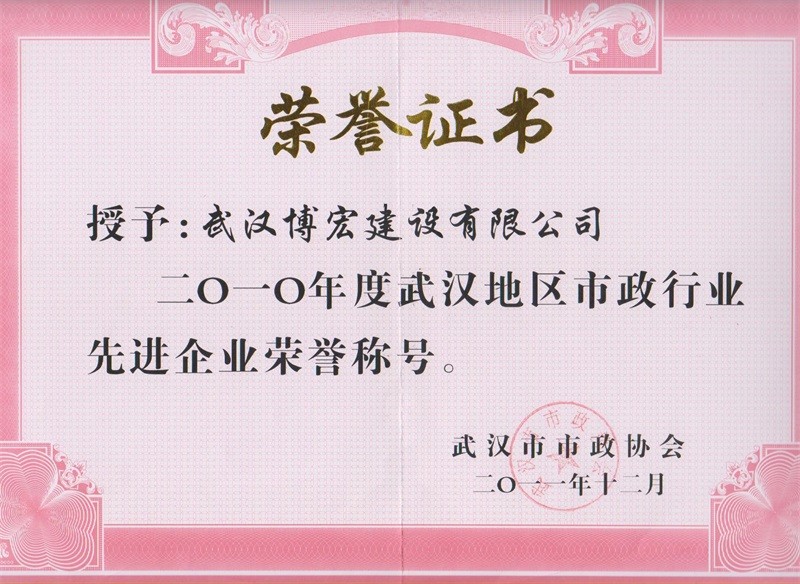 2010年度武漢地區(qū)市政行業(yè)先進(jìn)企業(yè)榮譽(yù)稱號