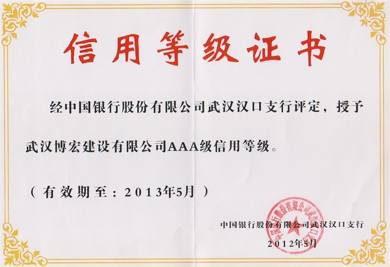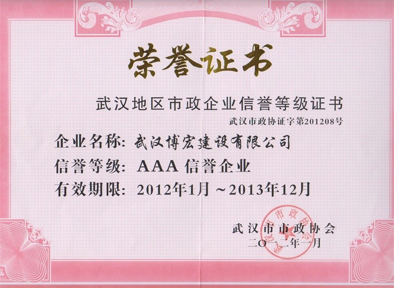 2012-2013年度武漢地區(qū)市政行業(yè)企業(yè)信譽(yù)等級證書