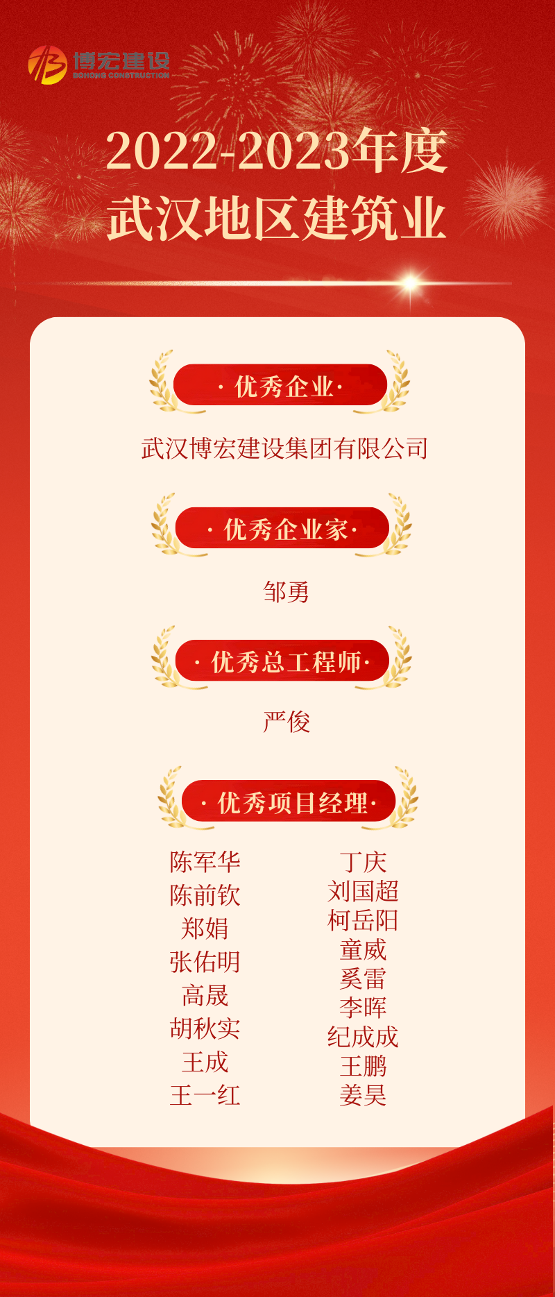 近日,2022-2023年度武漢地區(qū)建筑業(yè)優(yōu)秀企業(yè)、優(yōu)秀企業(yè)家、優(yōu)秀總工程師、優(yōu)秀項目經(jīng)理選樹結(jié)果正式發(fā)布,博宏建設(shè)集團喜獲“大豐收”,獲評1項優(yōu)秀企業(yè)、1人獲評優(yōu)秀企業(yè)家、1人獲評優(yōu)秀總工程師、17人獲評優(yōu)秀項目經(jīng)理!