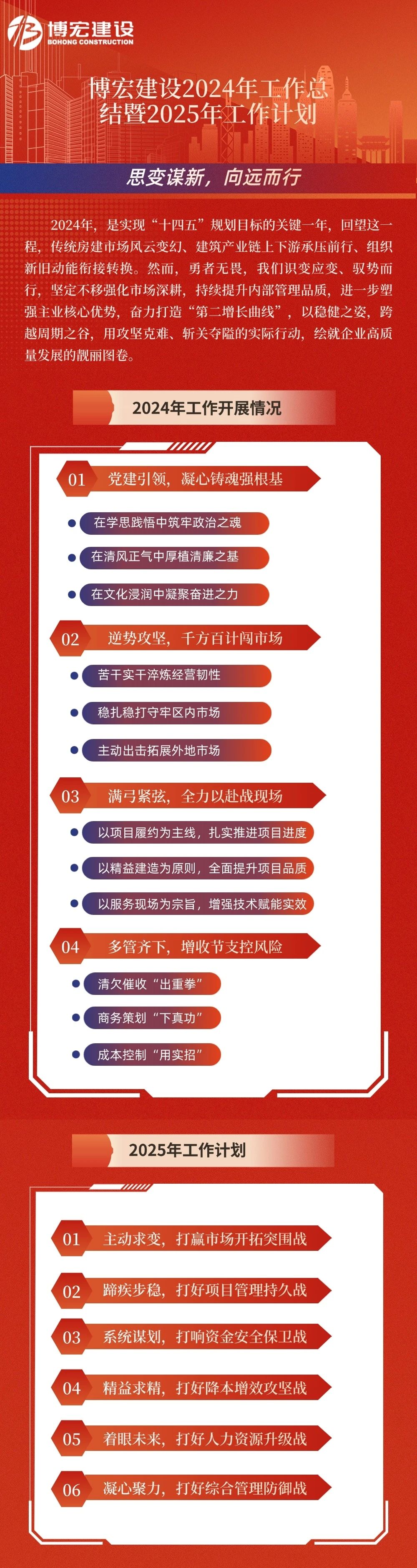 1月24日-25日,博宏建設(shè)2024年度總結(jié)表彰暨2025年工作研討會(huì)順利召開。公司黨委班子、部門負(fù)責(zé)人、項(xiàng)目經(jīng)理和員工代表共80余人參加會(huì)議。集團(tuán)黨委書記嚴(yán)悌文、董事長虞志鵬、常務(wù)副總經(jīng)理錢濤受邀出席會(huì)議。會(huì)議由公司黨委副書記郭一清主持。